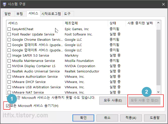 서비스 탭으로 이동한 다음 하단의 모든 마이크로소프트 서비스 숨기기에 체크합니다.