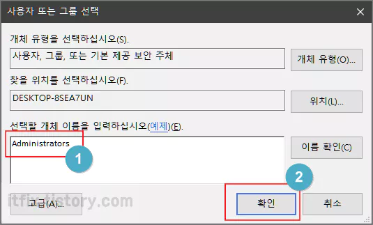 다음에 열리는 사용자 또는 그룹 선택 창에서 Administrators를 타이핑하여 입력한 다음 확인 버튼을 눌러 줍니다.