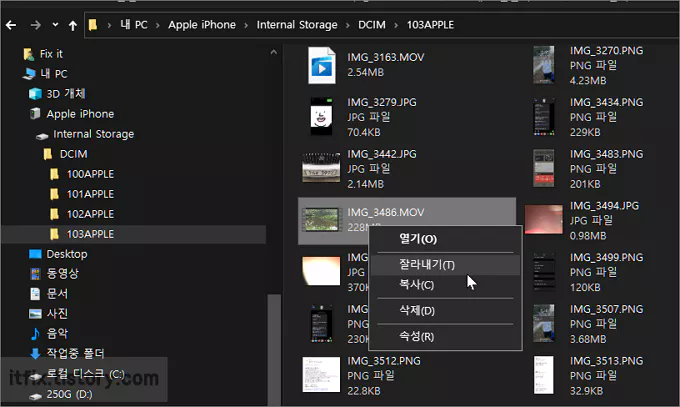 대부분의 영상이 MOV 확장자 형태의 동영상으로 저장되는 데, 편집할 동영상 원본을 마우스 우클릭한 다음 복사 또는 잘라 내기한 다음 PC의 원하는 폴더에 붙여 넣기 하면 됩니다. 잘라 내기할 경우 아이폰에서 영상이 사라지게 되니 주의하시기 바랍니다.