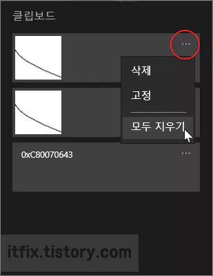 아래의 클립보드 이미지에서 보는 바와 같이 클립보드에 담겨있는 아무 항목이나 점 3개를 클릭한 다음 해당 항목만 삭제하거나 고정하기 또는 모든 항목 지우기 메뉴를 사용할 수 있습니다.