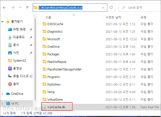 위의 경로로 진입하면 IconCache.db라는 이름의 파일이 보입니다. 이 파일을 마우스 우클릭한 다음 삭제를 클릭해 삭제해 줍니다. 이후 PC를 재시작해 줍니다.