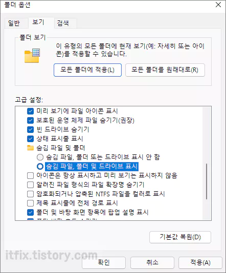 폴더 옵션의 보기 탭에서 중간쯤에 있는 숨김 파일, 폴더 및 드라이브 표시 옵션을 선택해 준 다음 적용 및 확인 버튼을 눌러 줍니다. 아래의 이미지는 윈도우 11의 폴더 옵션 창입니다.