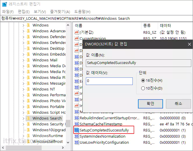 우측에 있는 항목들 중 SetupCompletedSuccessfully 항목을 더블 클릭하고 값을 1에서 0으로 바꿔 줍니다. 이후, 레지스트리 편집기를 닫고 PC를 재시작한 다음 문제가 해결되었는지 살펴봅니다.