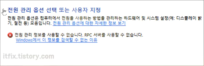 전원 관리 정보를 사용할 수 없습니다. RPC 서버를 사용할 수 없습니다라는 오류 메시지와 함께 전원 관리 옵션을 설정할 수 없는 경우가 있습니다. 이는 윈도우의 전원 관리 권한을 다른 프로세스에서 제어하고 있을 경우에 발생할 확률이 높습니다.