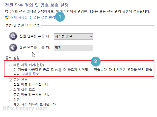 이제 PC를 재시작한 다음 제어판 > 시스템 및 보안 > 전원 옵션 > 전원 단추 작동 설정으로 진입한 다음 빠른 시작 부분이 보이면 위에서 설명한 방법으로 체크 표시를 해제하고 다시 한번 PC를 재시작합니다.