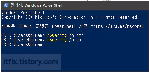 먼저 최대 절전 모드를 활성화시키기 위해 작업 표시줄의 윈도우 시작 로고를 마우스 우클릭한 다음 Windows PowerShell(관리자)을 실행합니다. 그 다음으로 아래의 명령어를 입력합니다.