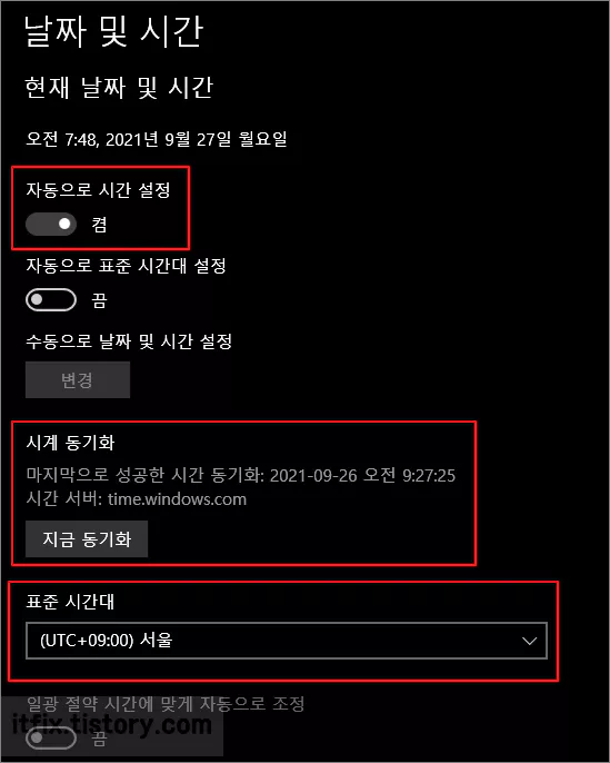 시간 설정은 자동을 켜 두고, 표준 시간대는 서울을 기준으로 하도록 하며 지금 동기화 버튼을 한번 눌러 줍니다.