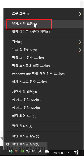 먼저, 작업 표시줄의 날짜가 표시된 알람 영역 부분을 마우스 우클릭한 다음 날짜/시간 조정을 클릭합니다.