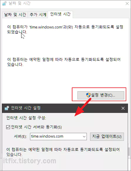 시간 서버와 동기화하는 설정 부분은 제어판에서도 볼 수 있는데, 시계 및 국가 > 날짜 및 시간 > 시간 및 날짜 설정에 있는 인터넷 시간 탭을 클릭하여 살펴볼 수 있습니다.