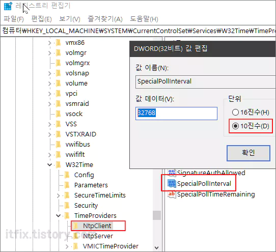 위의 경로로 들어간 다음 SpecialPollInterval 항목을 더블 클릭하면 10진수일 경우 32768초(16진수로는 8000)로 설정되어 있으며 이 값은 약 9.1시간 정도에 해당합니다.
