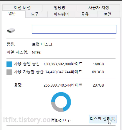 탐색기를 열고 윈도우가 설치된 C드라이브를 마우스 우클릭한 다음 속성을 클릭합니다.