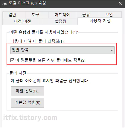 마지막으로 사용자 지정 탭을 클릭한 다음 일반 항목에 최적화를 선택해 준 다음 모든 하위 폴더에 적용에도 체크해주고 하단의 적용 및 확인 버튼을 눌러 줍니다.