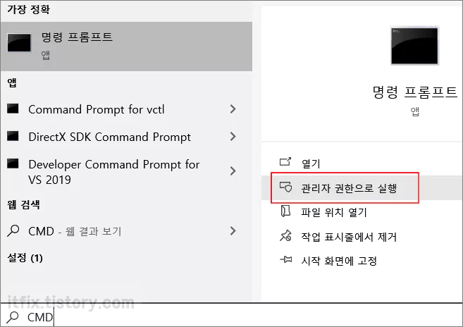 작업 표시줄의 검색 상자에 CMD라고 입력한 다음 명령 프롬프트를 관리자 권한으로 실행합니다.