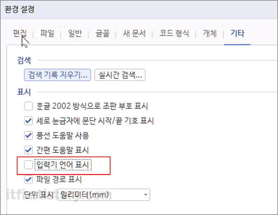 기타 탭에서 '입력기 언어 표시' 부분의 체크 표시를 해제한 다음 설정 버튼을 누르면 다음부터 이 기능이 사라지게 됩니다.