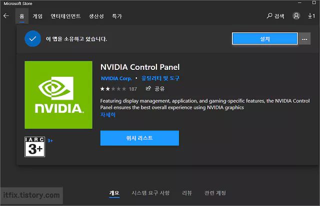 제거하고 MS 스토어에서 NVIDIA를 검색해 NVIDIA 제어판을 설치하면 모든 문제가 해결될 것 같지만, 여기서 또 문제가 발생합니다. 설치가 진행되는 것 같지만 동의 팝업창이 뜬 다음 버튼을 눌러 주면 이후에 아무런 창도 뜨지 않는 데, 또 설치가 완료된 것처럼 표시되며, 시작 아이콘도 만들어 줍니다. 하지만 이건 빈 껍데기로 추정됩니다.