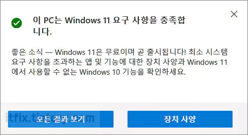 지금 확인 버튼을 클릭하면 아래의 이미지처럼 '이 PC는 Windows 11 요구 사항을 충족합니다.'라는 팝업창이 열리게 됩니다.