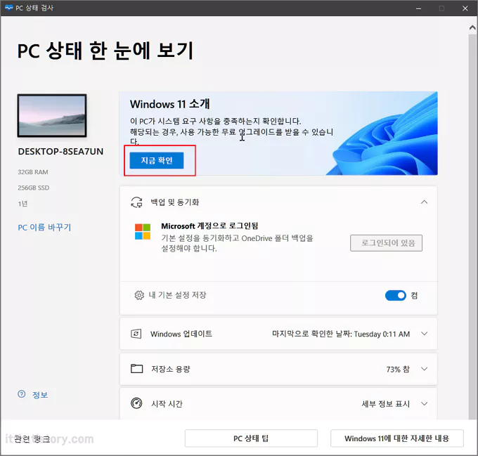 사용 중인 윈도우 10 PC의 설정을 변경하여 조건을 모두 충족시켰다면 수정 요구 사항이 없는 아래의 이미지와 같은 PC 상태 검사 창이 열리게 됩니다.