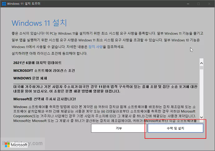 수락 및 설치 버튼을 누르면 윈도우 10에서 윈도우 11로의 업그레이드가 시작됩니다.