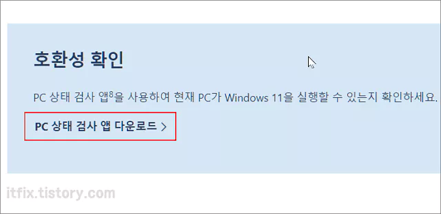 아래의 페이지로 이동한 다음 페이지의 중간쯤에 있는 PC 상태 검사 앱 다운로드를 클릭하고 WindowsPCHealthCheckSetup이라는 프로그램을 다운로드하여 실행시켜야 합니다.