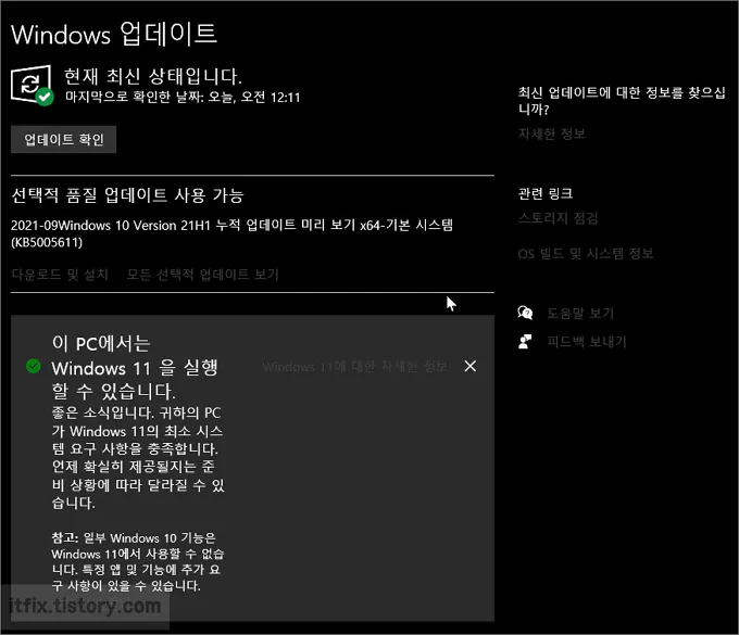 마지막으로 윈도우 설정에서 업데이트 및 보안 > Windows 업데이트 항목으로 들어가 보면 이전에는 보이지 않던 초록색 체크 표시가 있는 창이 하나 떠 있습니다.