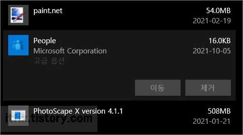 이제 윈도우 설정 > 앱 항목으로 들어간 다음 설치된 앱 항목들에서 더 이상 People이 보이지 않는 것을 확인할 수 있습니다.