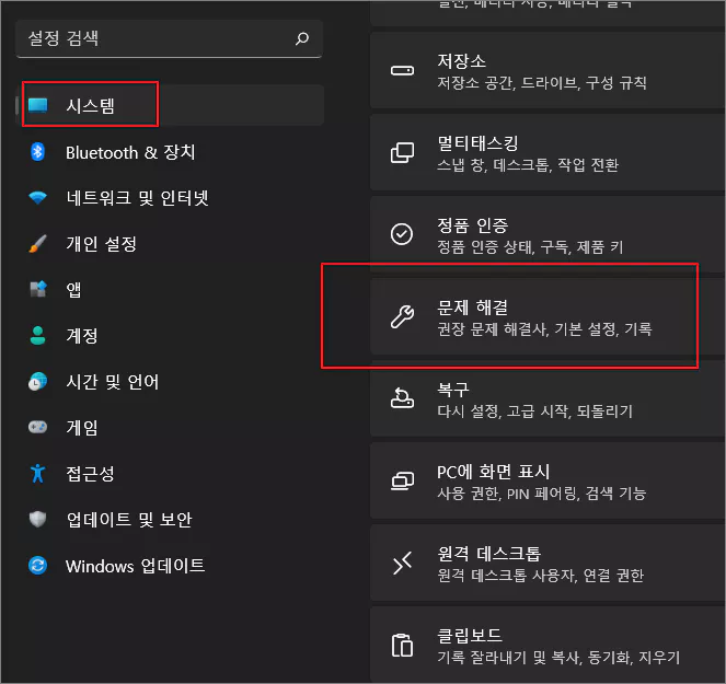 문제 해결사 영역이 기존의 윈도우 10에서는 설정의 업데이트 및 보안 영역에 있었는데, 윈도우 11에서는 설정의 시스템 영역으로 이동하여 찾는 데 약간 시간이 걸렸습니다.