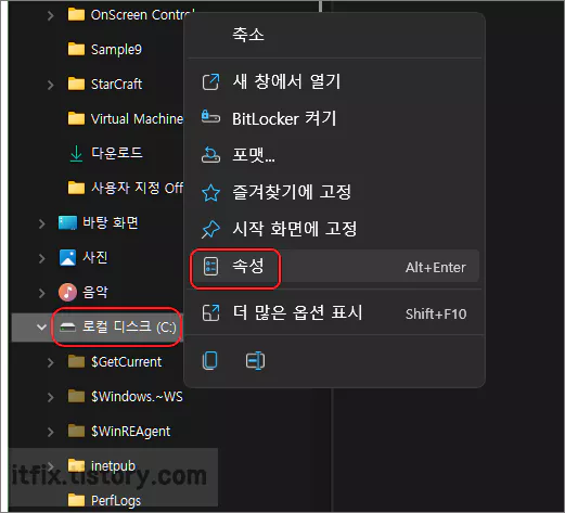 1. 윈도우 11의 파일 탐색기를 열고 C드라이브를 마우스 우클릭한 다음 속성을 누릅니다.