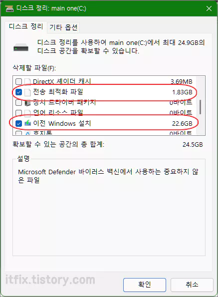 제 경우를 예로 들면 이전 윈도우10의 백업 파일이 22.6기가, 윈도우즈 업데이트용 전송 최적화 파일이 1.83기가로 둘만 합쳐도 24기가가 넘습니다. 상당한 디스크 공간의 낭비입니다.