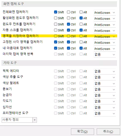 노란색 형광펜 부분의 설정 때문에 PrtScr 키를 누를 경우 픽픽의 캡처 도구가 우선적으로 실행되게 됩니다.