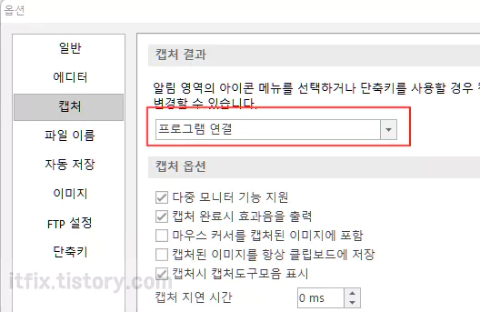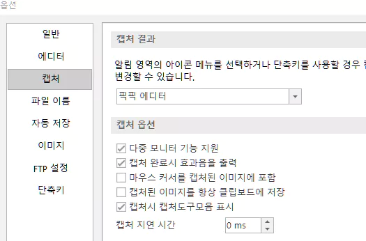 다만, PC를 재시작할 경우 캡처 항목의 결과 에디터를 픽픽 에디터로 연결해 둔 부분이 풀어져 버리는 경우가 있습니다. 이 경우에는 귀찮지만 옵션에서 다시 캡처 항목을 클릭한 다음 픽픽 에디터를 연결해 주어야 합니다.