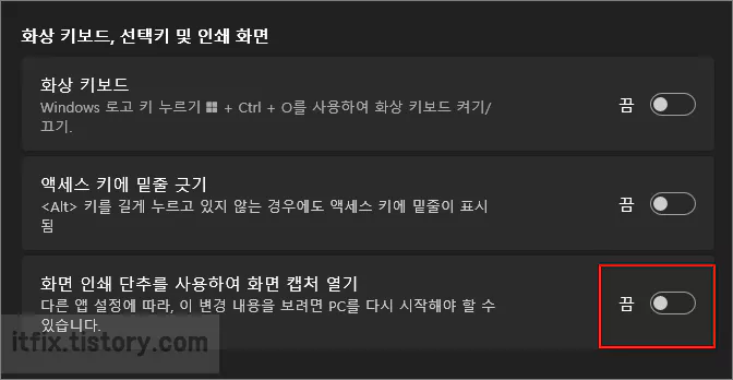 윈도우 설정 > 접근성 > 화상 키보드, 선택키 및 인쇄 화면으로 진입한 다음 가장 아래에 있는 '화면 인쇄 단추를 사용하여 화면 캡처 열기' 옵션을 꺼두도록 합니다.