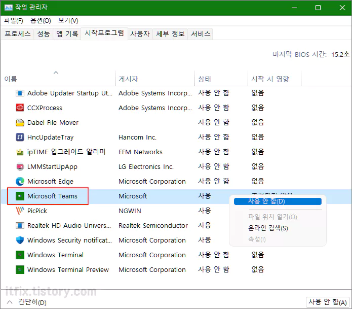먼저, 윈도우 시작 로고를 우클릭한 다음 '작업 관리자'를 클릭합니다. 작업 관리자에서 시작 프로그램 탭을 선택한 다음 'Microsoft Teams'를 마우스 우클릭하고 '사용 안 함'을 선택해 주도록 합니다.