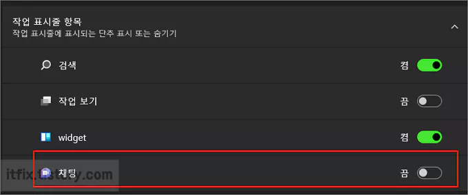 작업 표시줄을 마우스 우클릭한 다음 작업 표시줄 설정을 클릭하고 설정 창이 열리면 채팅 항목의 우측에 있는 스위치를 클릭하여 기능을 꺼둡니다.