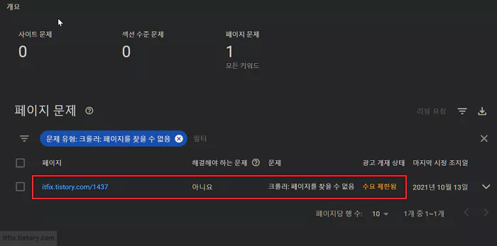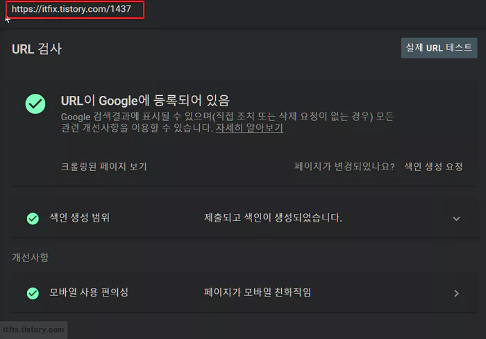 구글 서치 콘솔에 들어가서 해당 페이지가 문제가 있는지 URL 검사를 하고, 오류 페이지가 있는지 확인해 봤지만 서치 콘솔 쪽에서는 해당 페이지에 대하여 아무런 오류가 없다고 보고하고 있었고 오류 페이지로 잠고 있지도 않는 상태였습니다. 지적하는 크롤링도 문제가 없어 보였습니다.