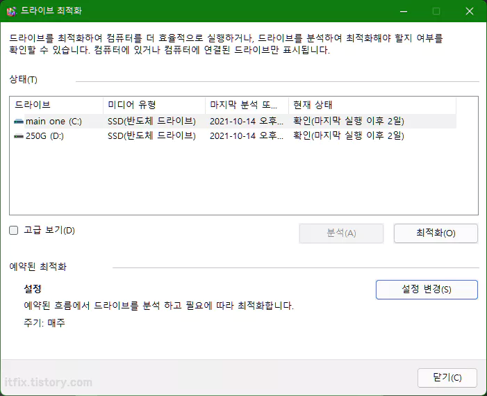 윈도우 10에서 이러한 디스크 최적화 작업을 진행해 보셨던 분들은 거의 동일한 과정을 거치게 되므로 크게 어려운 것은 없습니다.