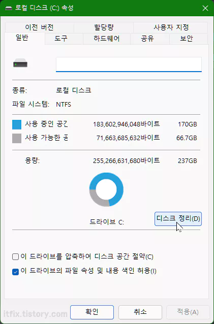 속성 창이 열리면 일반 탭에서 디스크 정리 버튼을 클릭해 작업을 진행할 수 있습니다.