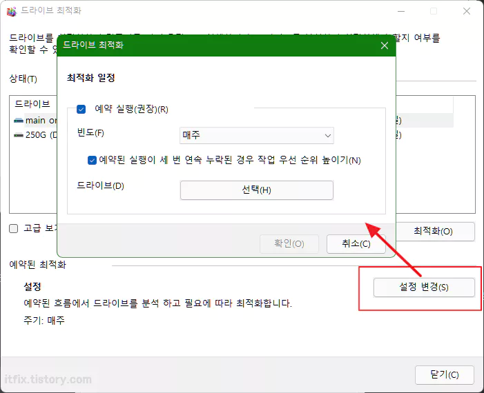 윈도우 11의 최적화 기본 설정은 일주일 간격 예약으로 설정되어 있으며 예약이 연속으로 3번 이상 실행하지 못했을 경우에 백그라운드 우선순위를 스스로 높이도록 설정되어 있습니다.