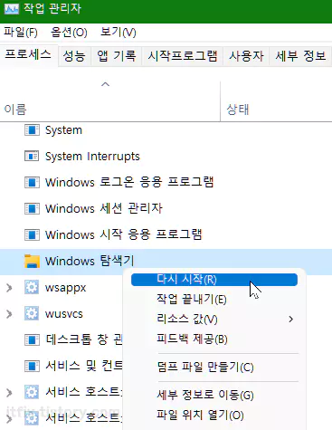 작업 관리자에서 Windows 탐색기라고 표시되는 프로세서를 우클릭한 다음 다시 시작을 클릭합니다. 상황에 따라 Windows 탐색기가 여러 개 있는 경우도 있는 데, 다시 시작을 클릭했을 때 아무거나 작업 표시줄이 사라졌다 다시 나타난 다면 설치에 성공한 것입니다. 이때, 약 50메가 정도 분량을 마이크로소프트 윈도우 업데이트 서버에서 필요한 부분에 한해 다운로드하게 되며, 설치 상황을 작업 표시줄 우측 알림 영역 위쪽으로 팝업창을 통해 알려주게 됩니다.