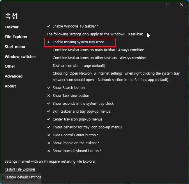 속성 창이 뜨면 'Enable missing system tray icons'를 클릭한 다음 스위치를 끄거나 켜는 방식으로 알림 영역에 표시될 아이콘을 사용자 설정할 수 있습니다.