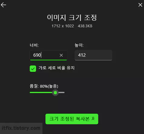 너비만 입력한 다음 가로 세로 비율 유지에 체크하면 원본 이미지 전체를 사용자가 입력한 수치에 맞게 비율을 유지하며 조절해 줍니다. 다만, 이 기능은 복사본으로 저장하는 기능만 지원하므로 원본을 직접 변경해 원본 자체를 저장하는 것은 아닙니다.
