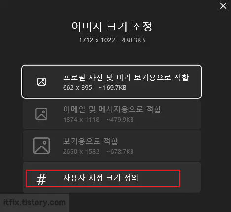 이미지 크기 조정 팝업 창에서 가장 아래에 있는 사용자 지정 크기 정의를 클릭합니다.