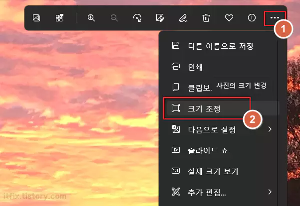 사진 프로그램의 상단 메뉴 끝에 있는 점 3개를 누른 다음 크기 조정을 클릭합니다.