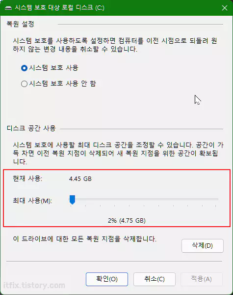 아래의 이미지는 현재 복원 지점 데이터들이 사용하고 있는 데이터는 4.45기가이며 최대 사용량은 총 디스크 용량의 2%인 4.75기가로 설정되어 있다는 것을 보여주고 있습니다. 아마도 복원 지점이 한두 개 더 추가되면 가장 오래된 하나의 복원 지점이 삭제될 것으로 보입니다.