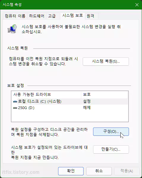 시스템 속성의 시스템 보호 탭이 열리면 구성 버튼을 클릭합니다.