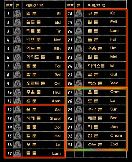 다음으로 최상위권 룬들로는 27번 옴 룬부터 33번 조드 룬까지가 있으며 이들에 관하여는 공략 몬스터의 층을 두텁게 하기 위해 드롭률 5순위까지로 분석한 내용입니다.