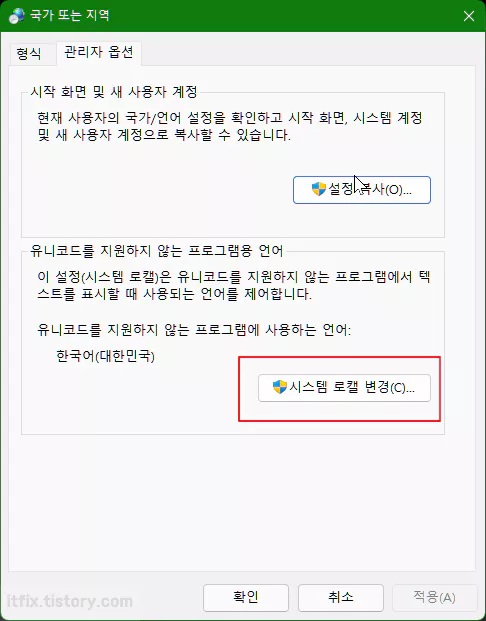 윈도우 설정 > 시간 및 언어 > 언어 및 지역 > 관련 설정에서 기본 설정 언어를 클릭하면 국가 또는 지역 설정 창의 관리자 옵션 탭이 열리게 됩니다. 시스템 로캘 변경 버튼을 클릭합니다.