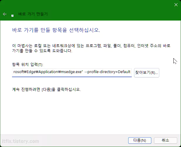 바로 가기 만들기 창에서 항목 위치 입력란에 커서를 위치한 상태에서 마우스 우클릭 후 붙여 넣기 해 좀 전에 복사해 둔 경로가 들어가도록 합니다. 다음을 누르고 적당한 바로 가기의 이름을 적어 주면 작업이 끝나고 바탕화면에 바로가기가 만들어지게 됩니다.