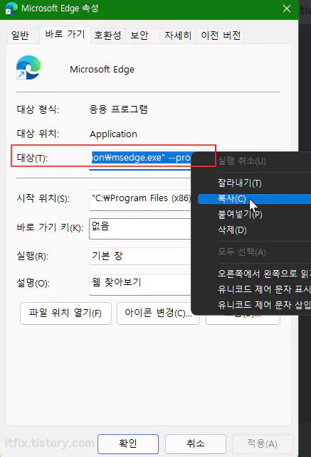 속성 창이 뜨면 대상이라는 부분의 내용을 마우스 우클릭하여 전체 복사해 둡니다.