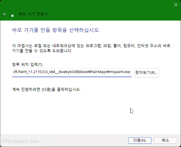 즉, 위의 주소를 위에서 살펴본 바탕 화면에 바로 가기 만들기 과정 중 항목 위치 입력란에 입력하고 과정을 진행하면 그림판의 바로 가기를 바탕 화면에 만들 수 있습니다.