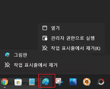 만일, 그림판이 작업 표시줄에 등록되어 있었다면 위와 같이 바탕 화면에 그림판의 바로 가기를 만든 다음 작업 표시줄에서는 고정 해제하면 그림판 아이콘 이동 작업이 완료됩니다.